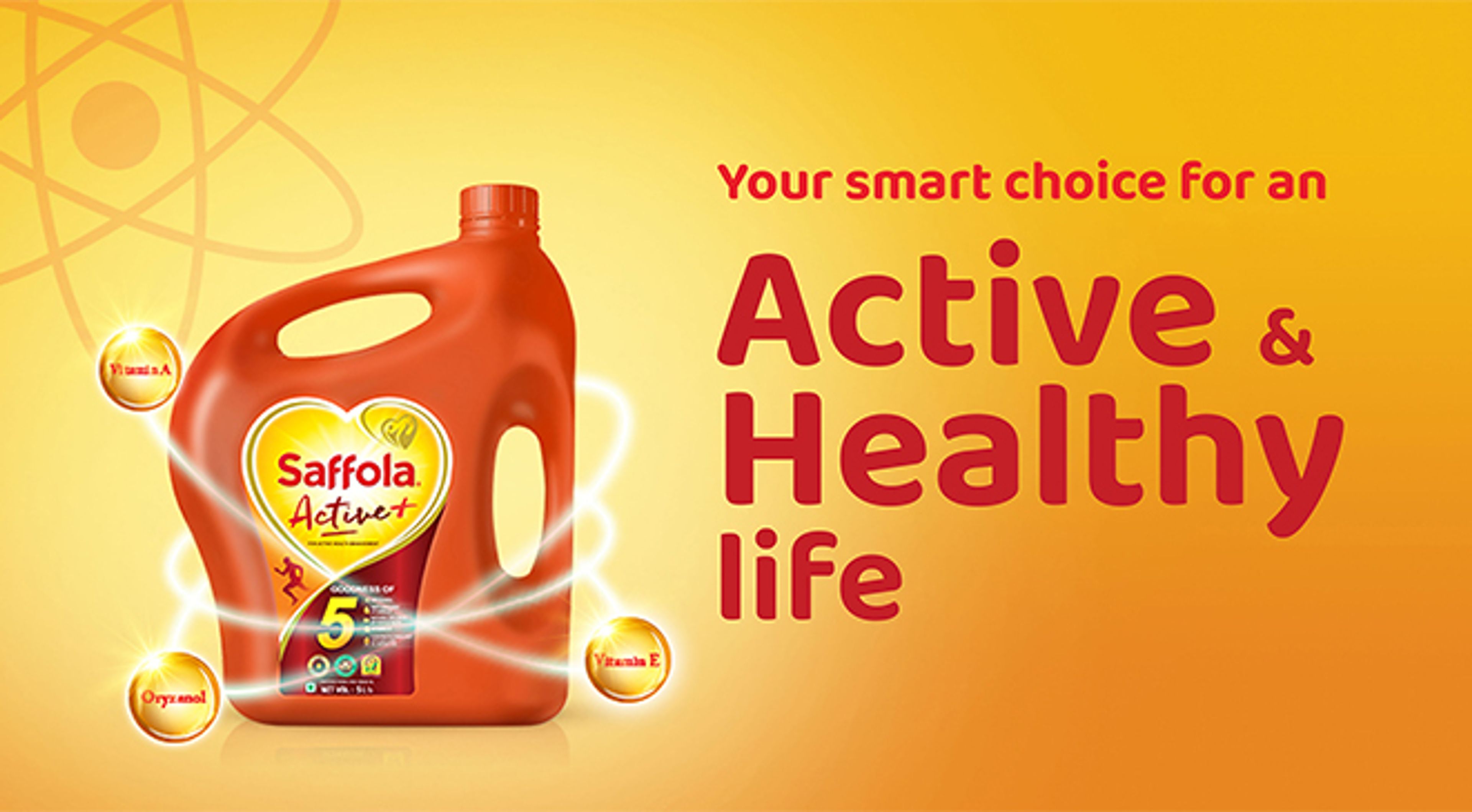 Saffola Active has been introduced as the only blended edible vegetable oil. Saffola Active provides a balance of fatty acids with additional benefits of Omega 3. Omega 3 fatty acids are associated with many health benefits. Additionally, antioxidant properties of Oryzanol and Vitamin E in Saffola Active helps reduce cholesterol levels. Saffola Active is a unique blend of 80% refined rice bran oil and 20% soybean oil, now fortified with Vitamin A.